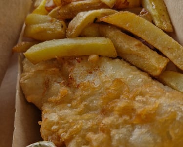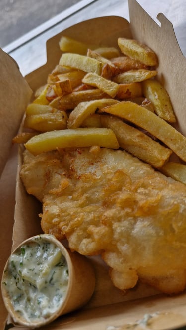 filet de cabillaud enrobé d’une pate legere frit, frites et sauce tartare.